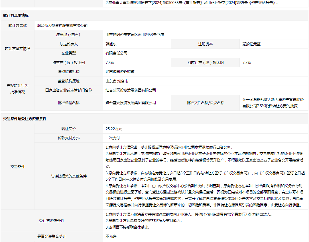 • 轉(zhuǎn)讓方:煙臺(tái)藍(lán)天投資控股集團(tuán)有限公司