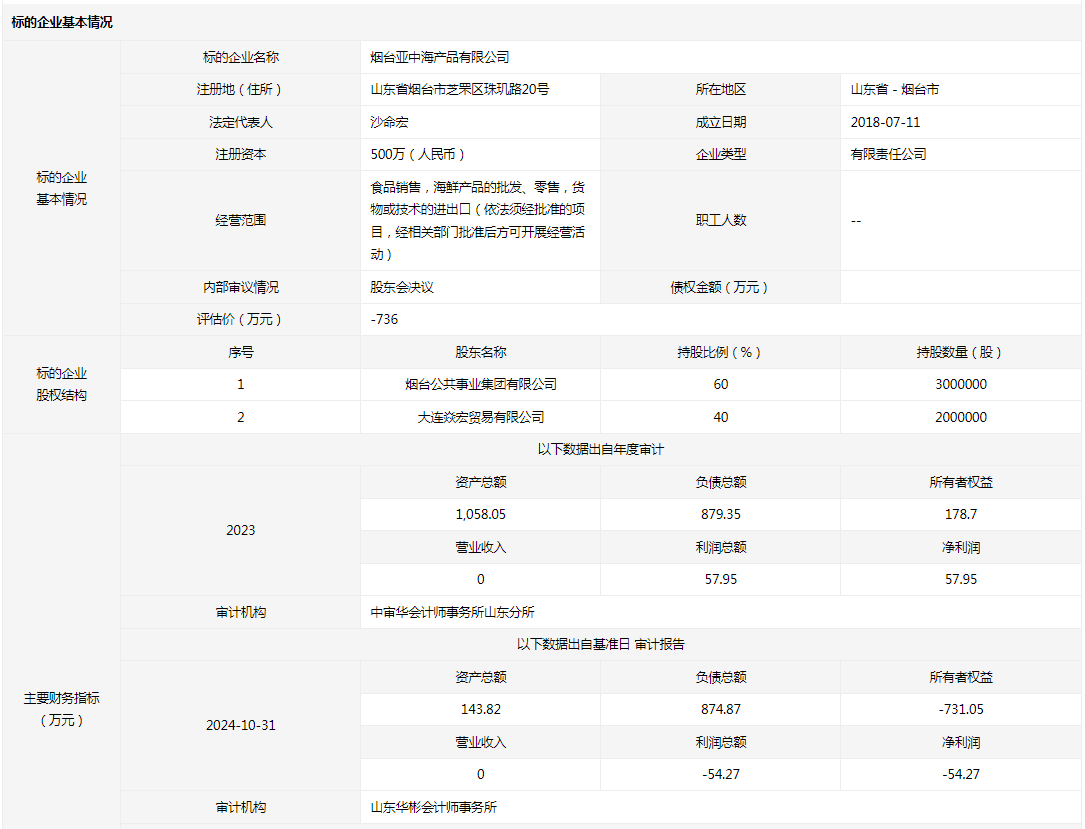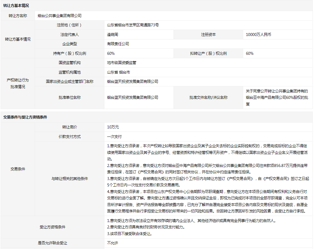 煙臺亞中海產(chǎn)品有限公司60%國有股權(quán)