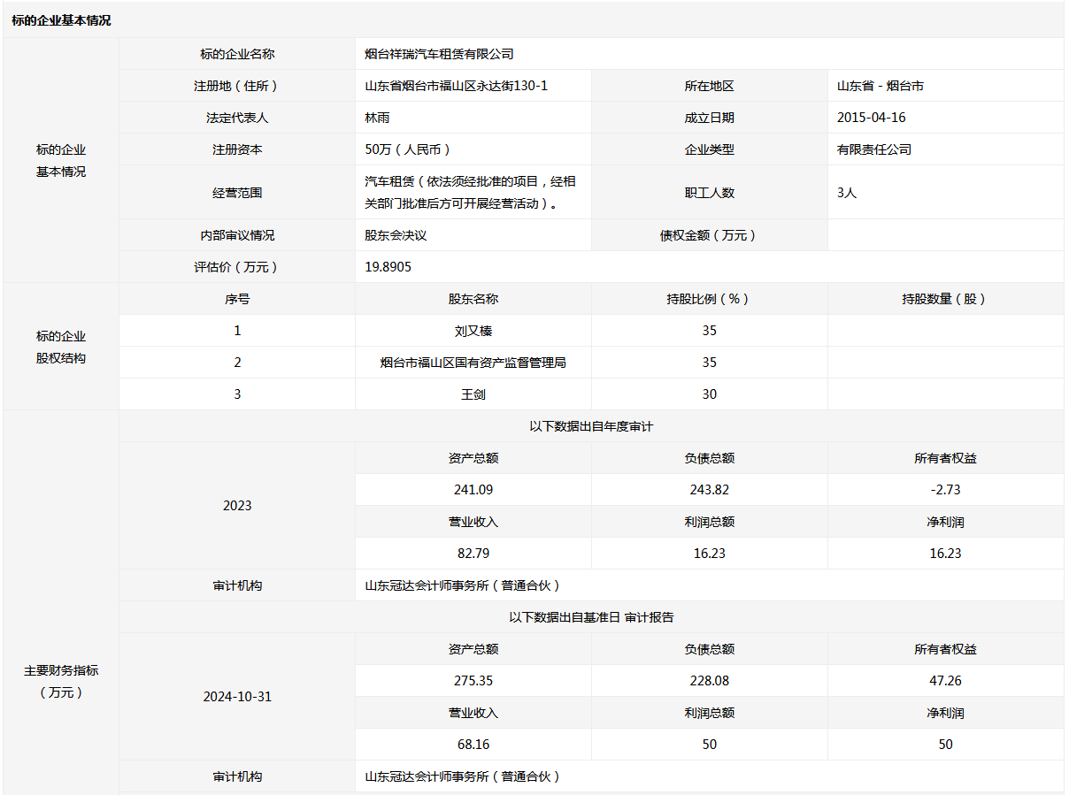 煙臺(tái)祥瑞汽車租賃有限公司35%國(guó)有股權(quán)