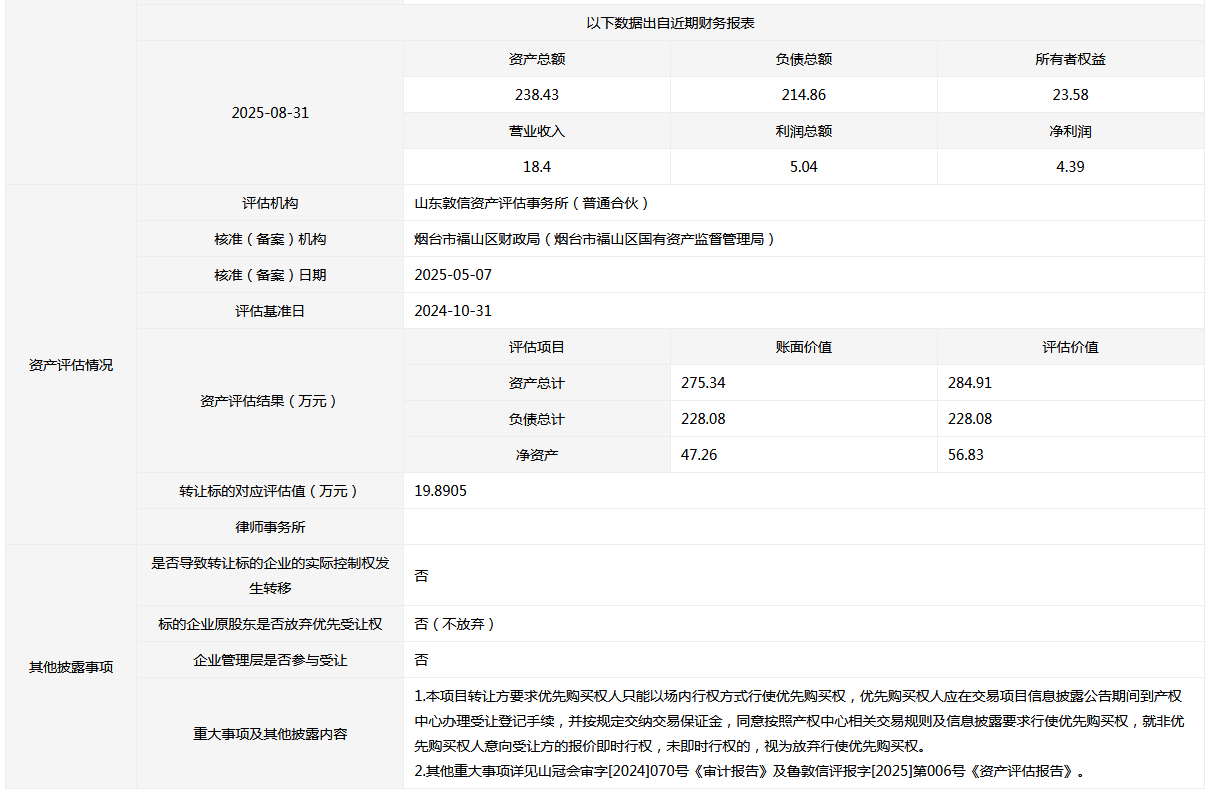 - 轉(zhuǎn)讓方: 煙臺(tái)市福山區(qū)財(cái)政局(煙臺(tái)市福山區(qū)國(guó)有資產(chǎn)監(jiān)督管理局)