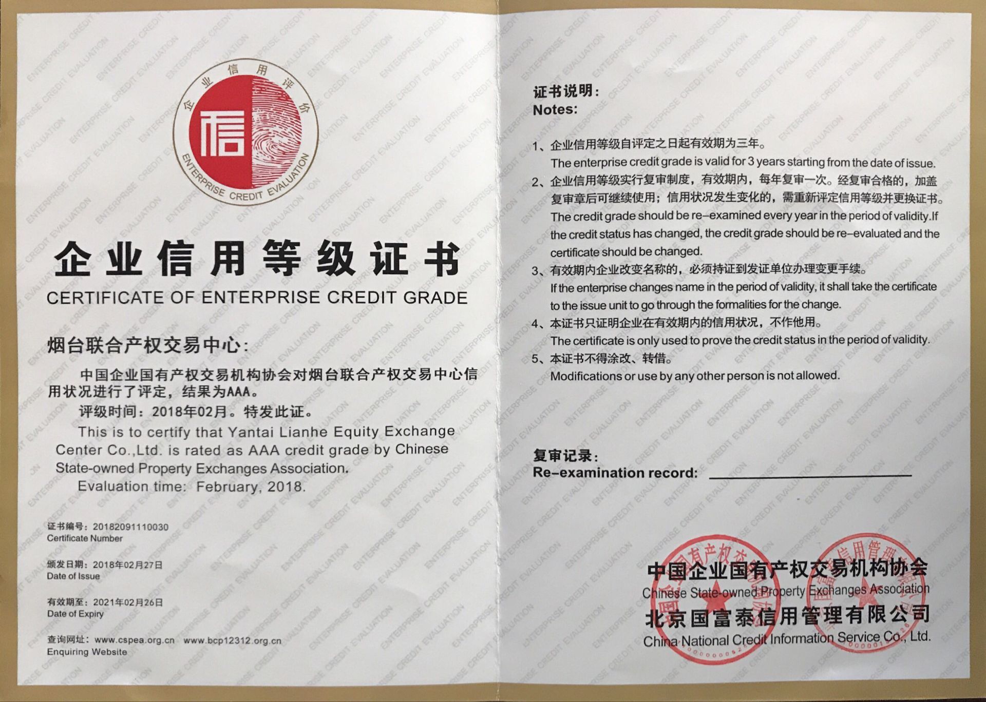 近日,在中國產(chǎn)權(quán)交易協(xié)會(huì)組織開展的全國產(chǎn)權(quán)交易行業(yè)信用等級(jí)評(píng)價(jià)活動(dòng)中,煙臺(tái)聯(lián)合產(chǎn)權(quán)交易中心(以下簡(jiǎn)稱“聯(lián)合產(chǎn)權(quán)”)榮獲信用最高等級(jí)AAA級(jí)信用企業(yè)稱號(hào)。